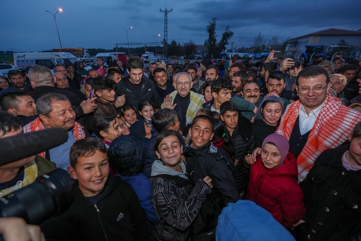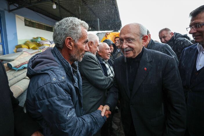 Burada yemekhane olarak kullanılan çadıra giren Kılıçdaroğlu, bir küme depremzede ile görüşürken, çok sayıda vatandaş da dışarıda yağmurun altında onu bekledi.