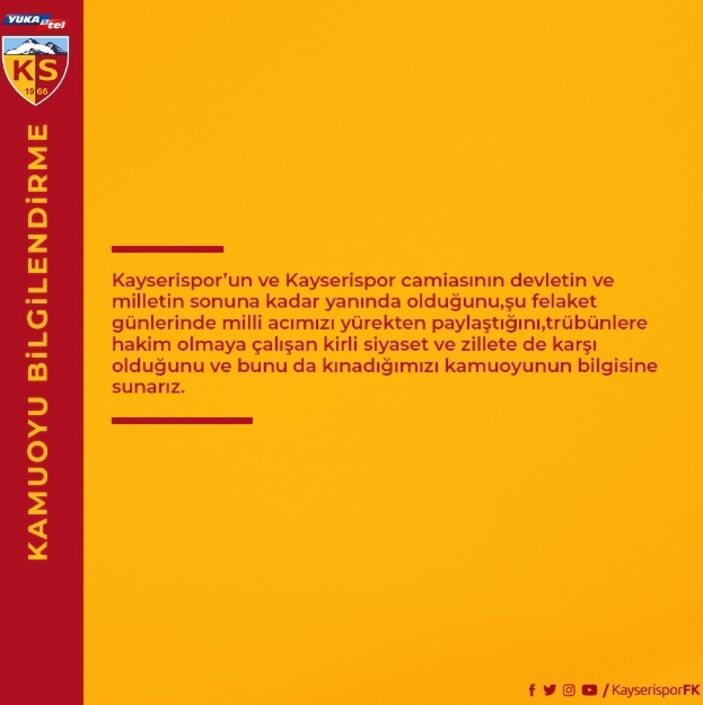 “Kayserispor Kulübü ve Kayserispor topluluğu sonuna kadar devletinin ve milletinin yanındadır. İçinde olduğumuz şu felaket günlerinde milletimizin acısını yürekten paylaşırken bu acıyı vesile yaparak tribünlerde yapılmaya çalışılan kirli siyaset ve zilletin farkında olduğumuzu ve bunu kınadığımızı kamuoyunun bilgisine sunarız”