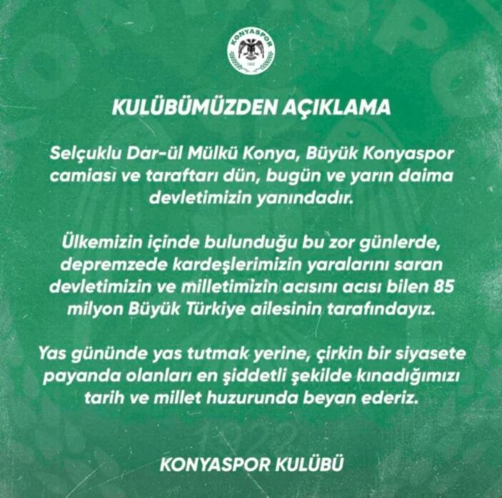 “Selçuklu Dar-ül Mülkü Konya, Büyük Konyaspor topluluğu ve taraftarı dün, bugün ve yarın hep devletimizin yanındadır. Ülkemizin içinde bulunduğu bu sıkıntı günlerde, depremzede kardeşlerimizin yaralarını saran devletimizin ve milletimizin acısını acısı bilen 85 milyon Büyük Türkiye ailesinin tarafındayız. Yas gününde yas tutmak yerine, berbat bir siyasete payanda olanları en şiddetli formda kınadığımızı tarih ve millet huzurunda beyan ederiz”